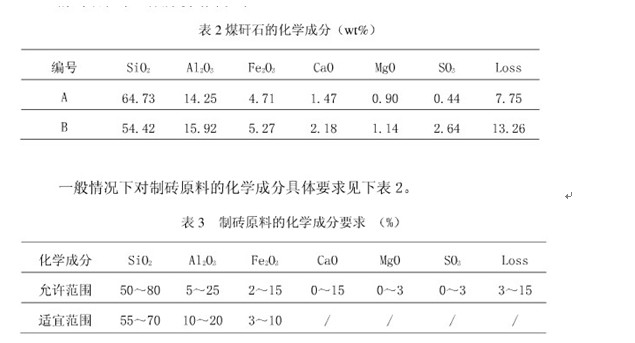 將A礦和B礦煤矸石原料分別進行發熱策測試,其結果為:0.05MJ / kg (12cal / g ) ; (0.23MJ/ kg ( 55Cal/ g )。通常認為燒結磚瓦所用配合料的發熱量以1672kJ / kg 左右為宜,由于煤矸石的形成過程復雜,其發熱量變化較大,所以制磚用原料的煤矸石必須進行發熱量的測定,以便根據焙燒制品需要的熱值,確定不同的配合比來進行控制,使得配合料的發熱量在更佳值附件波動。