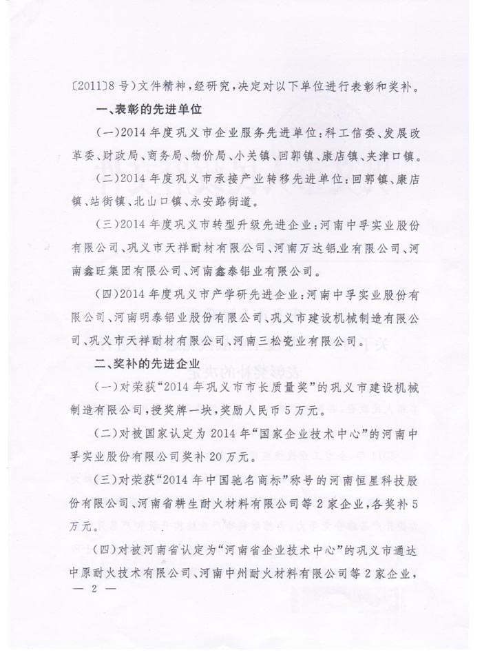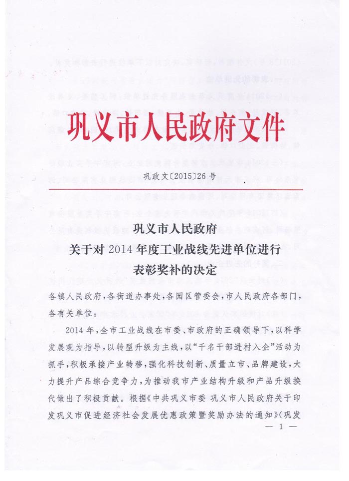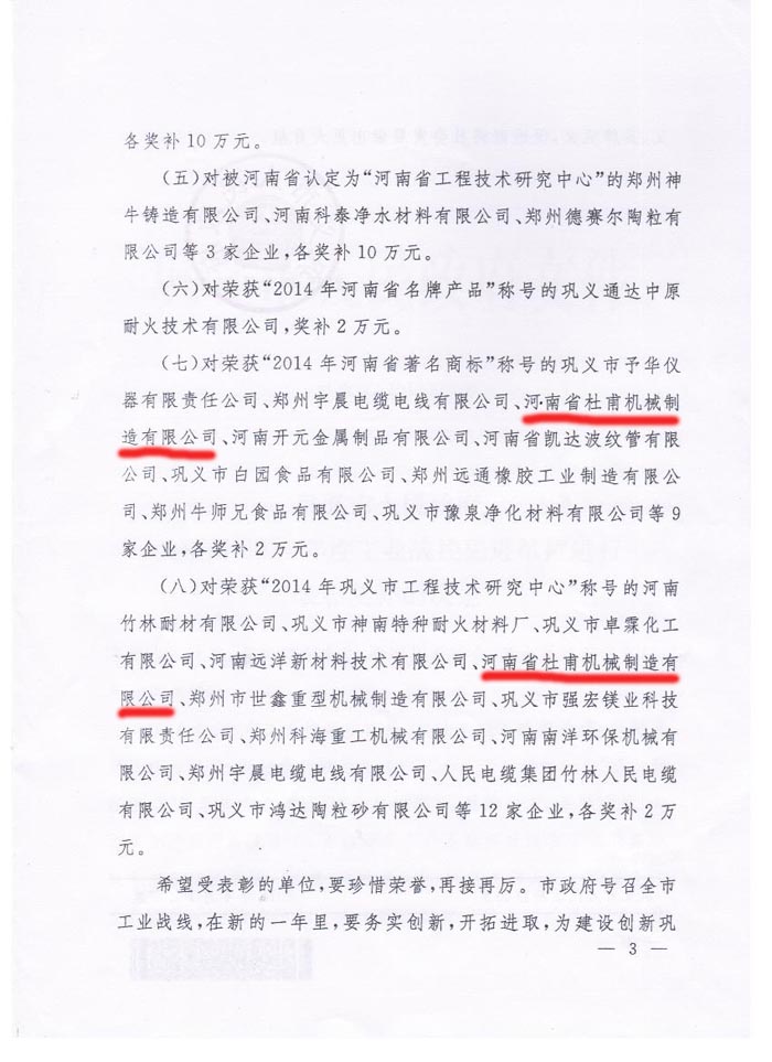 對包括我公司-河南省杜甫機械制造有限公司在內的12家榮獲“2014年鞏義市工程技術研究中心”稱號的企業各獎補2萬元。